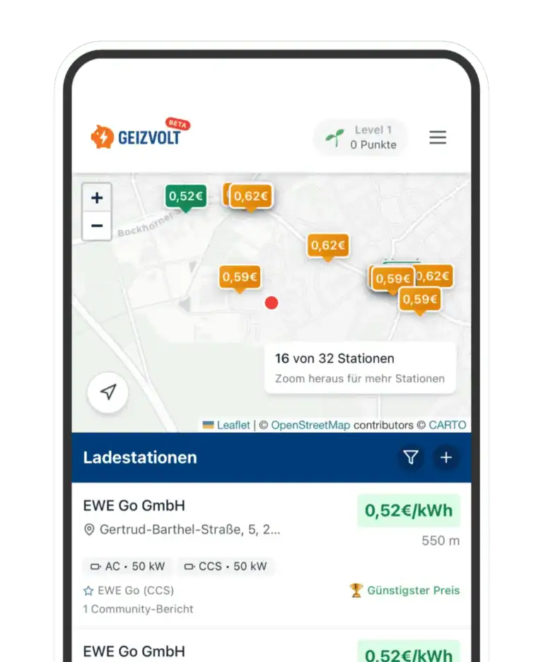 Mit GeizVolt haben wir eine App entwickelt, die allen Fahrerinnen und Fahrern von Elektroautos den Alltag erleichtert. Unser Ziel: mehr Transparenz bei den Ladepreisen und damit faire Möglichkeiten, unterwegs immer günstig Strom zu laden.